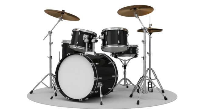 Black Drum Set Ready for a Beat: A professional drum set with black drums and chrome hardware, ready for a powerful performance. Perfect for music productions, band promotions, and more.