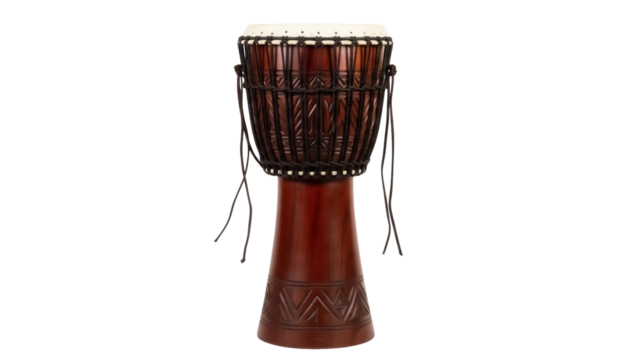 Brown djembe drum isolated PNG on transparent background, traditional African percussion instrument with intricate carvings for music and cultural events