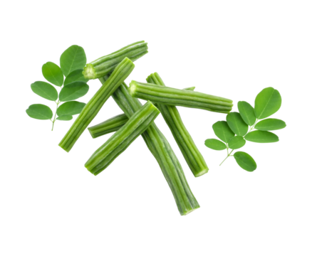 Fresh green moringa oleifera pods and leaves isolated on transparent background for healthy eating