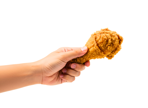 Hand holding a crispy fried chicken drumstick isolated on transparent background