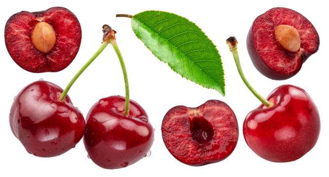 Collection of sweet red cherries isolated on white background. Cut out PNG file.