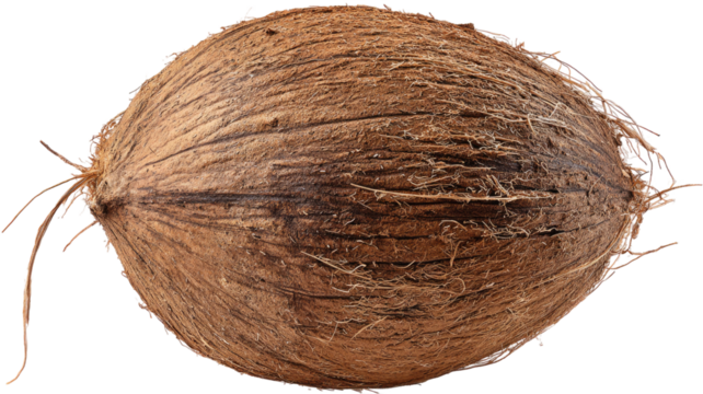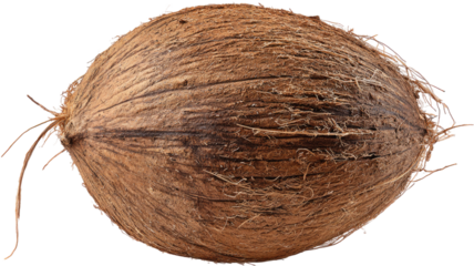 A whole fresh hairy brown coconut shell fruit isolated on a white background as a healthy tropical nut and exotic food object for a natural vegetarian diet