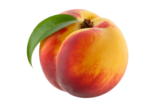 A ripe peach with a green leaf and stem rests against a white background.