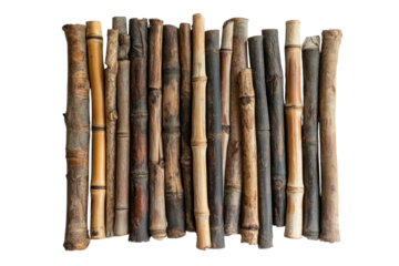 Assorted bamboo poles create a natural textured background for crafts and design projects or architectural elements on transparent background