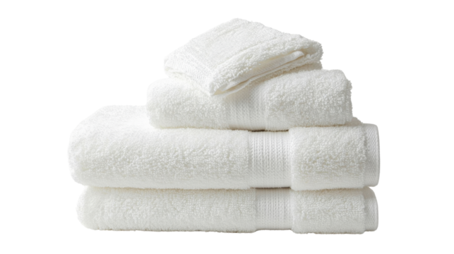 Gray towel set with two hand towels on top of two larger bath towels, isolated on a transparent background