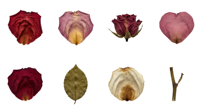 Dried red rose set including petals, whole bud, green leaf, and stem isolated. Botanical elements for floral design and wedding stationery.