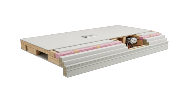 Construction cross-section: Drywall, insulation, wood joists, plumbing