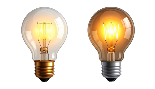 Dual Modern Electric Bulb Designs Highlighting Glowing Filaments isolated on transparent background
