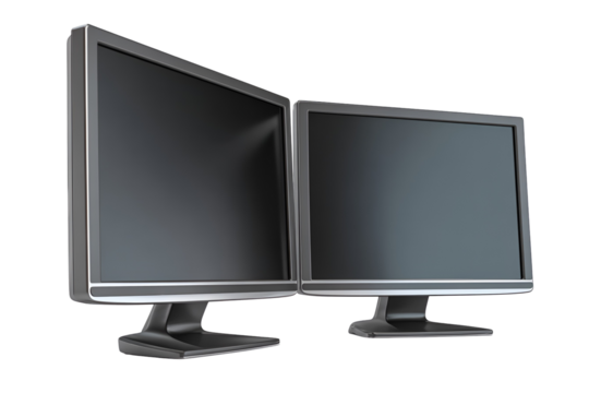 Dual monitors on a modern stand against black The screens are blank and ready to display content transparent background