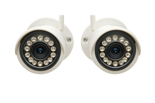 This image shows a black dual-lens security camera with a unique checkered design, against a black background.