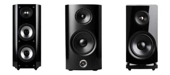High-Quality black tower speakers' modern home audio system with powerful stereo sound with dual woofers, a sleek modern design, and metallic accents, isolated on a transparent background