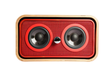 Retro red speaker with large round drivers, perfect for music lovers. This stylish audio device combines vintage design with modern sound quality, enhancing any space