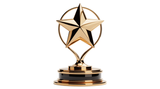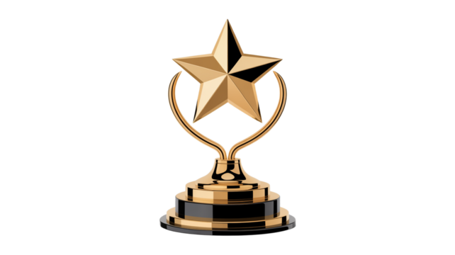 Ultra-realistic 3D golden trophy with detailed star, glossy metallic shine, elegant curved handle, tri-layer base, soft shadows,  premium award, celebration vector. Transparent background.