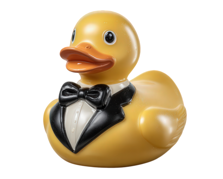 Adorable yellow rubber duck toy, charming and funny character wearing formal black tuxedo and bow tie. Cute dapper gentleman isolated on transparency background