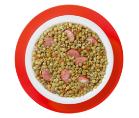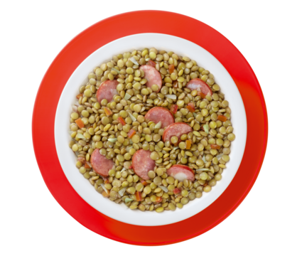prato com lentilha cozida com linguiça e ervas isolado em fundo transparente