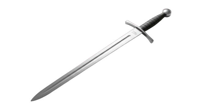 Shiny sword with dark handle, on plain background