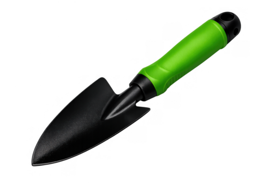 Garden hand trowel with green handle for planting and digging, isolated on transparent background