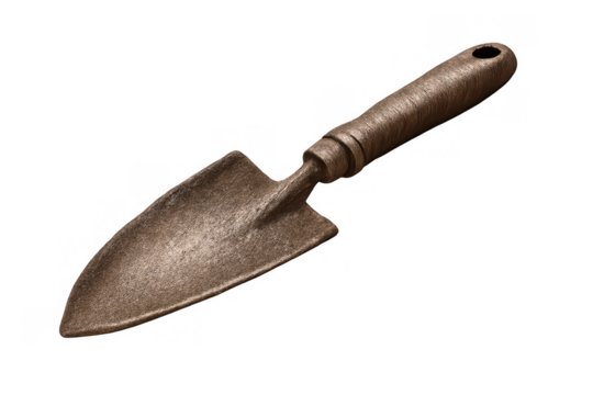 Hand trowel with soil for gardening, planting, and digging concepts on transparent background for spring and nature themes