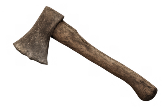 Old axe featuring a dull, rusty metal head and a worn wooden handle, isolated on a transparent background
