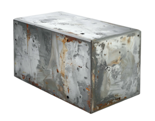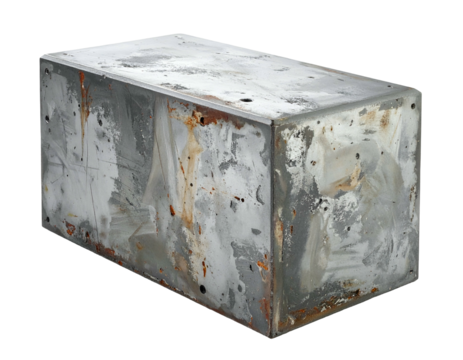 Photorealistic close-up of a weathered, dull grey concrete orb with pockmarked texture & chipped edges, hard light & deep shadow on white studio background, industrial prototype concept