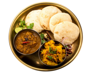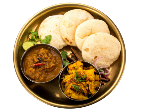Overhead Shot of Brass Plate with Luchi, Cholar Dal, Aloo Dum, and Payesh, Traditional Bengali Meal, Isolated on Transparent Background