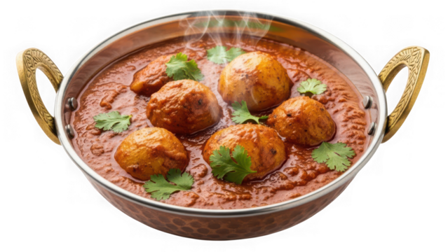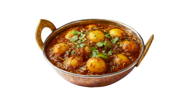 Delicious indian dum aloo curry in traditional copper karahi bowl isolated on transparent background