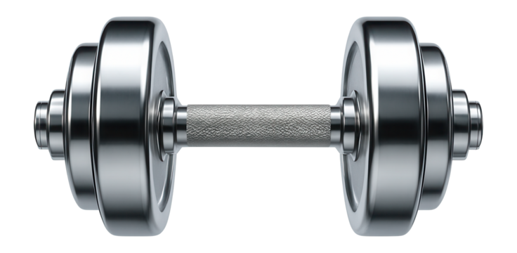 Pair of dumbbells with silver bar and black rubber weights isolated on transparent background