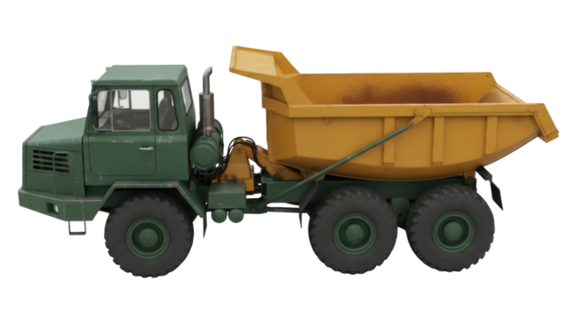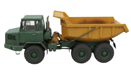Green and yellow dump truck PNG isolated on transparent background, heavy construction vehicle for building and transportation projects