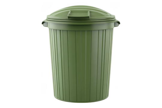 Olive green plastic trash can with lid, garbage container for waste disposal, recycling bin, rubbish bin, dustbin, household cleaning utensil, isolated on transparent background