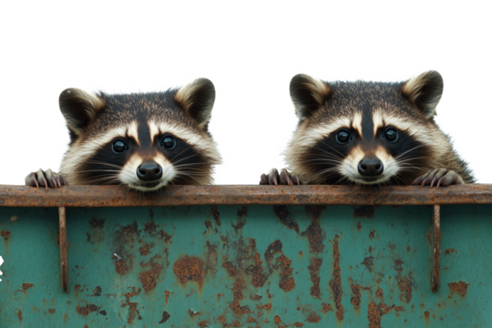 Two raccoons peeking out of a worn green metal trash bin, curious expressions, isolated on a transparent background.