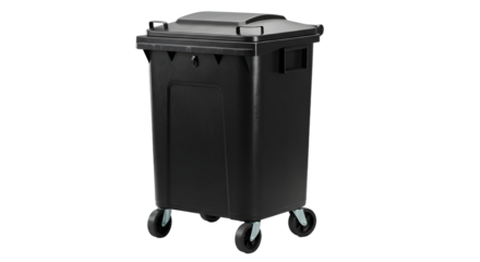 Black commercial plastic waste bin on wheels isolated on white background for efficient garbage disposal and collection
