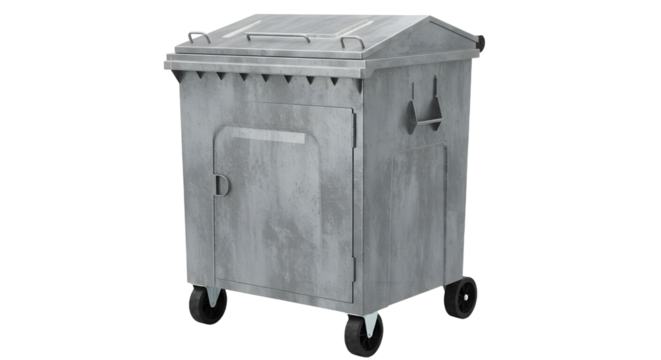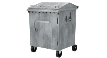 Industrial metal dumpster on wheels isolated on white background, waste management container perfect for recycling and trash disposal