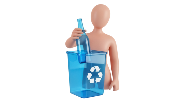 Isolated figure recycling glass bottle into blue container marked with recycling logo