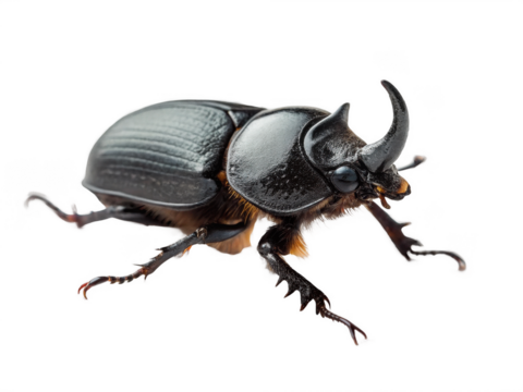 Dung beetle PNG isolated on transparent background, dark brown scarab with spiky legs for entomology and nature studies