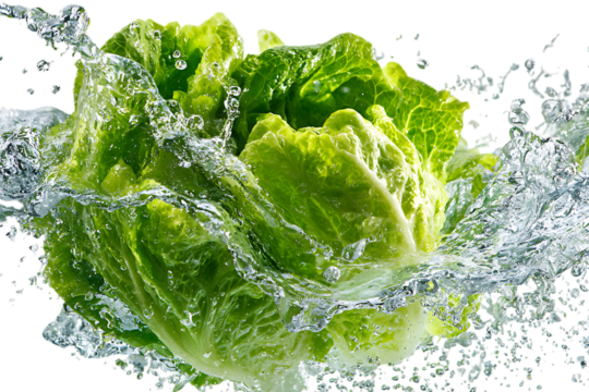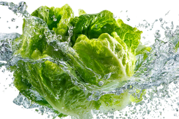 Crisp Lettuce Cascade: Vibrant green lettuce is doused in a refreshing splash of crystal-clear water, highlighting freshness and vitality.