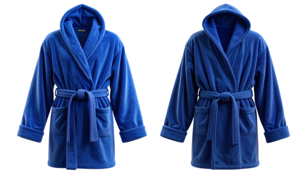 Luxurious blue hooded bathrobe comfort duo isolated on transparent background.