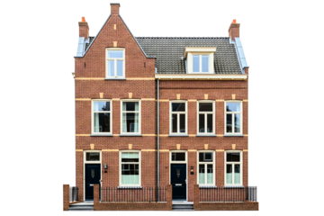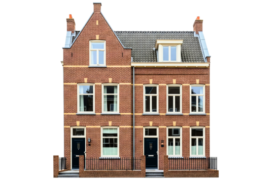 Traditional red brick duplex house facade isolated on a transparent background