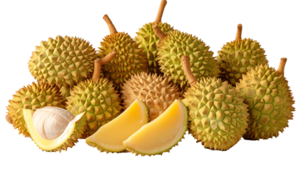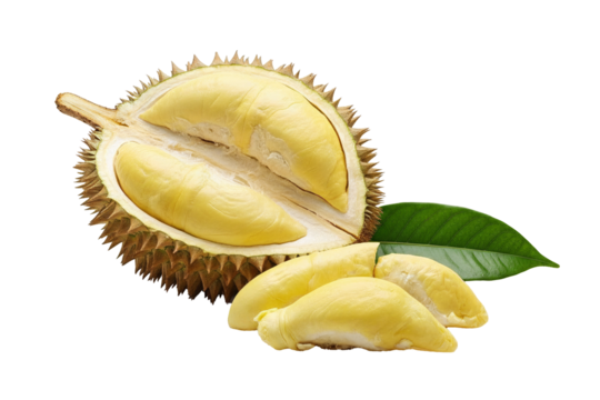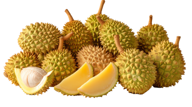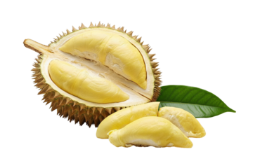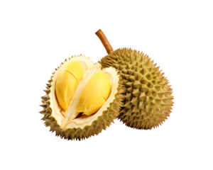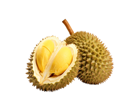 Two spiky durian fruits with one open, showcasing the vibrant yellow flesh inside, are perfect for food blogs, tropical themes, or culinary designs. Generative AI