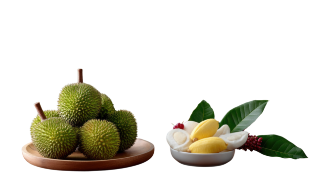 Durian Display: Capturing the tropical allure of durian, a platter of whole fruits alongside a bowl of creamy segments, fresh leaves adding a touch of freshness.