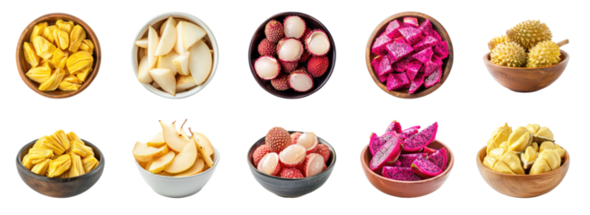 Collection of Durian fruit separated on a white backdrop