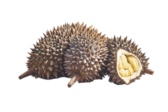Floating Durian: A captivating visual showcasing the king of fruits, durian, amidst levitating elements, revealing its unique texture, shape, and color and a burst of visual delight.