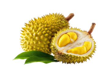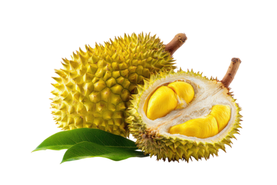Delicious durian fruit open half showing creamy yellow flesh tropical on transparent background food