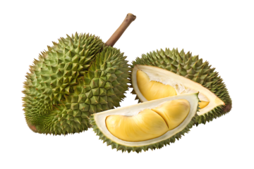 Fresh durian fruit with cut slice on transparent background