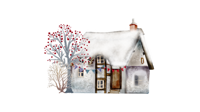 Winter scene of a snowy cottage with festive decorations and a tree