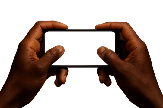 Dark-skinned hands holding a black smartphone horizontally, isolated on transparent background.