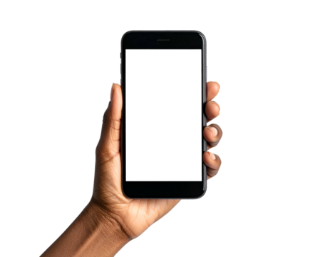 An isolated hand, dark-skinned, holding a blank smartphone with a black background
