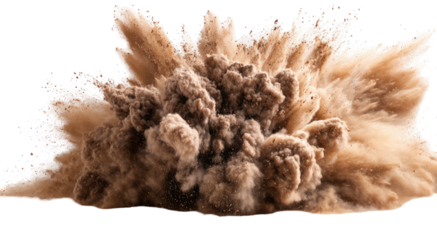 A powerful explosion erupts with a brilliant flash of light and a cloud of dark dust and debris scattering outwards against a white background.