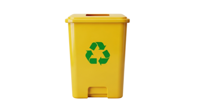 Isolated yellow recycling bin with green logo stands for waste disposal and ecology concept
