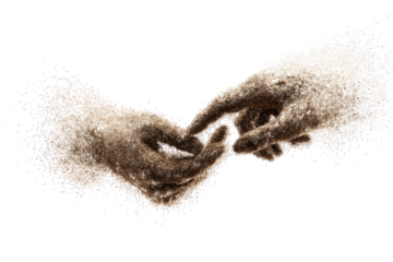 Two hands gently touching,  a swirling cloud of particles surrounds them