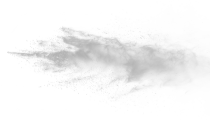 White gray dust powder explosion transparent PNG, isolated background. Dynamic blast eruption, monochrome color effect